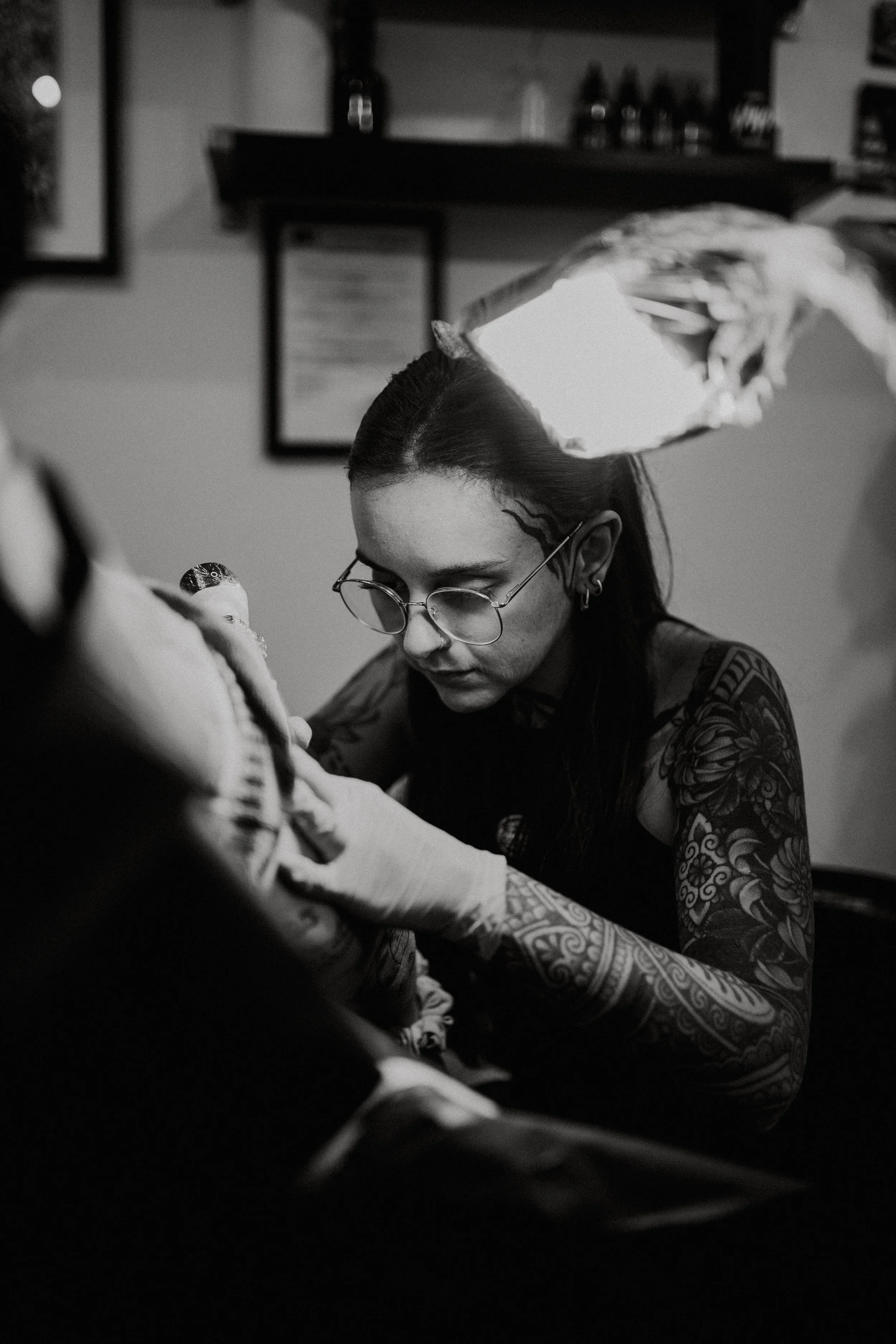 Bex specialises in blackwork, dotwork & pattern work and is co-owner of Freshly Ground Ink.